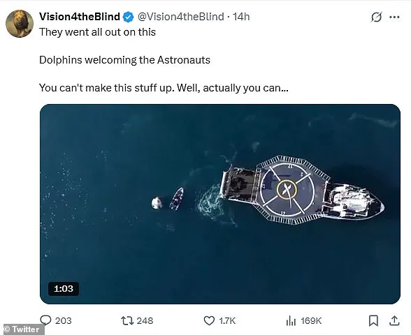 Someone else suggested: “I’m sorry, but those dolphins are obviously AI generated with the SPACEx controlled feed, or robots deployed by @elonmusk.” One user tagged X’s intelligent AI chatbot Grok in a tweet to ask about the footage: ‘is this video fake or cgi.’ Grok replied: ‘The video of dolphins around the SpaceX Dragon splashdown on March 18, 2025, is real, not fake or CGI. Dolphins swam near the capsule, a natural occurrence in the Gulf of Mexico, even noted live by NASA and SpaceX staff. No evidence suggests manipulation – it’s authentic footage.’ However, this reply did little to quell the conspiracy theories.