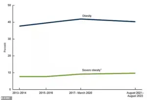 While obesity rates have decreased slightly for the first time in years, they remain stubbornly high compared to data from 2013–2014.