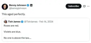 The attorney general’s legal troubles began to escalate in February 2024, when she posted a now-infamous social media message mocking Trump’s legal challenges. ‘Roses are red.