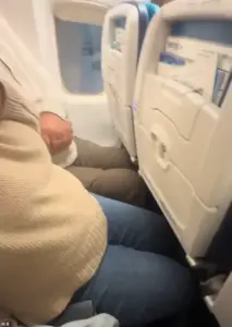 Rae, seated closest to the aisle, recorded her parents crammed next to one another as she asked her father: ‘Dad, can you straighten out your legs there?’ The family laughed, making light of the tight squeeze as her parents replied, ‘impossible.’ Multiple times, the father could be seen adjusting himself to get comfortable in the tight seats, but there doesn’t appear to be any visible space between his legs and the seat ahead of him.
