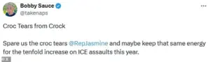 Conservative influencer Paul Szypula took to X to accuse her of ‘crocodile tears,’ writing, ‘Croc tears from Crock,’ while another user warned, ‘Spare us the croc tears @RepJasmine and maybe keep that same energy for the tenfold increase on ICE assaults this year.’ The criticism was not limited to the right; even some liberal celebrities, including Bowen Yang and Matt Rogers of Las Culturistas, urged their fans to avoid contributing to Crockett’s Senate campaign, with Rogers stating, ‘Don’t waste your money sending to Jasmine Crockett.