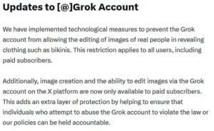The company announced that Grok will no longer be able to generate or edit images of real people in revealing clothing, such as bikinis, effectively curbing the ability of users to create non-consensual sexualized deepfakes.