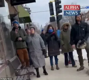 One protester was heard yelling, ‘Get out of our f***ing neighborhood,’ while another shouted, ‘If you’re not with us, you’re against us.’ The video shows the mob encircling the deli, with some protesters waving signs and others recording the confrontation on their phones.