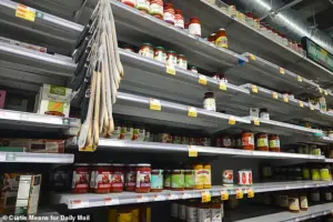 Among them was Laurie Laufer, a local who had spent the day scouring the store for groceries, her eyes scanning the shelves with a mix of urgency and resignation. ‘I happen to be having houseguests this Sunday who are supposed to leave on an airplane on Monday, and I don’t think they’re going anywhere,’ she said, her voice tinged with both humor and anxiety. ‘So I said, I’d better go buy some food in case I’m cooking for them.’
