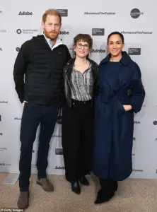 The couple, flanked by director Alysa Nahamias, posed on the red carpet in Utah, where Meghan delivered a speech praising the film and thanking attendees. ‘This film is probably the cutest at the festival,’ she said, adding that she and Harry were ‘proud and privileged’ to have worked on it.